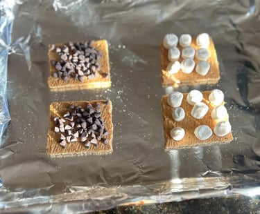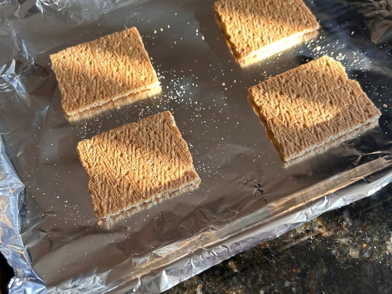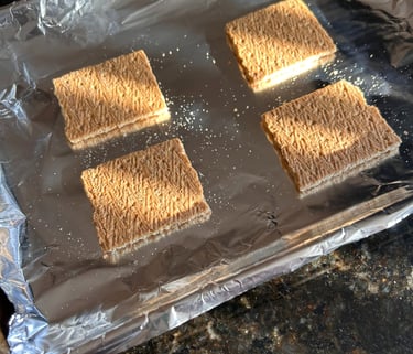 Take a whole graham cracker and snap in half (one for the bottom one for the top) and place 2 inches apart in a pan.